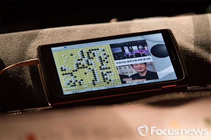 (서울=포커스뉴스) 9일 오후 서울 종로구 아름다운 극장에서 열린 인공지능과 바둑 심포지움 콘서트에서 한 관람객이 이세돌-알파고 바둑 대결을 핸드폰으로 보고 있다.