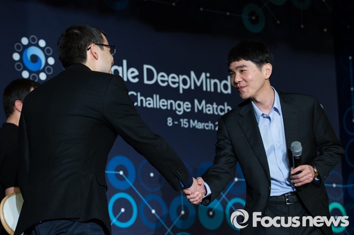 (서울=포커스뉴스) 바둑기사 이세돌(오른쪽) 9단이 9일 오후 서울 종로 포시즌스호텔에서 구글 딥마인드 챌린지 매치, 인공지능 바둑프로그램 알파고와의 첫번째 대국에 패배한 뒤 기자회견을 마치고 데미스 하사비스 구글 딥마인드 최고경영자와 악수하고 있다.