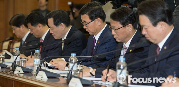 (서울=포커스뉴스) 10일 오전 서울 종로구 정부서울청사에서 열린 국가정책조정회의에서 이기권(오른쪽 세번째부터) 고용노동부 장관, 김현웅 법무부 장관, 강신명(맨 오른쪽) 경찰청장을 비롯한 참석자들이 황교안 국무총리의 모두발언을 듣고 있다.