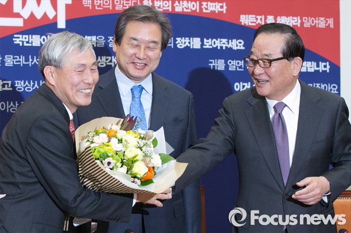 (서울=포커스뉴스) 프로바둑 조훈현(왼쪽) 9단이 10일 오전 서울 여의도 국회 새누리당 대표최고위원실에서 열린 입당식에 참석해 김무성(가운데) 대표, 서청원 최고위원의 축하를 받고 있다.