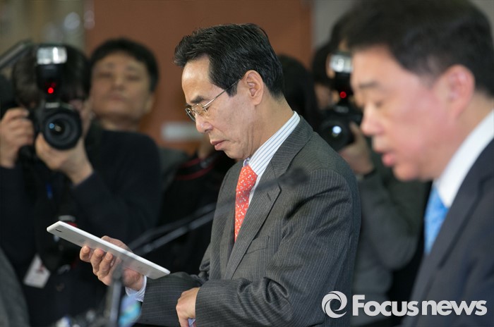 (서울=포커스뉴스) 홍창선(왼쪽) 더불어민주당 공천관리위원장이 10일 오전 서울 여의도 국회 정론관에서 김성수 대변인이 20대 총선 경선 및 단수지역과 2차 공천배제(컷오프) 명단 발표를 하고 있는 동안 태블릿PC를 살펴보고 있다.