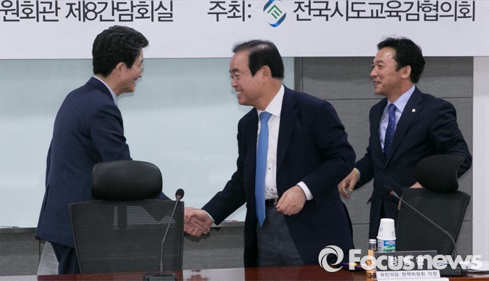 (서울=포커스뉴스) 10일 오전 서울 여의도 국회 의원회관에서 열린 누리과정 문제해결을 위한 정당 초청 토론회에 참석한 이목희(왼쪽부터) 더불어민주당 정책위의장, 장병완 국민의당 정책위의장, 정진후 정의당 원내대표가 인사하고 있다.