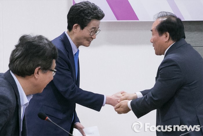 (서울=포커스뉴스) 10일 오전 서울 여의도 국회 의원회관에서 열린 누리과정 문제해결을 위한 정당 초청 토론회에 참석한 이목희(왼쪽 두번째) 더불어민주당 정책위의장과 장휘국(오른쪽) 전국시도교육감협의회장이 인사하고 있다.