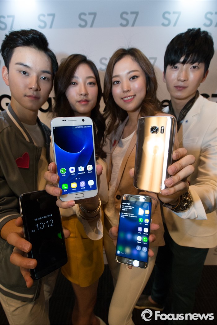 (서울=포커스뉴스) 10일 오전 서울 중구 신라호텔에서 삼성전자의 스마트폰 '갤럭시 S7 엣지와 갤럭시 S7'을 모델들이 선보이고 있다. 이번 제품은 듀얼 픽셀과 F1.7 조리개 탑재, 방수·방진과 대용량 배터리가 탑재되어 있다.