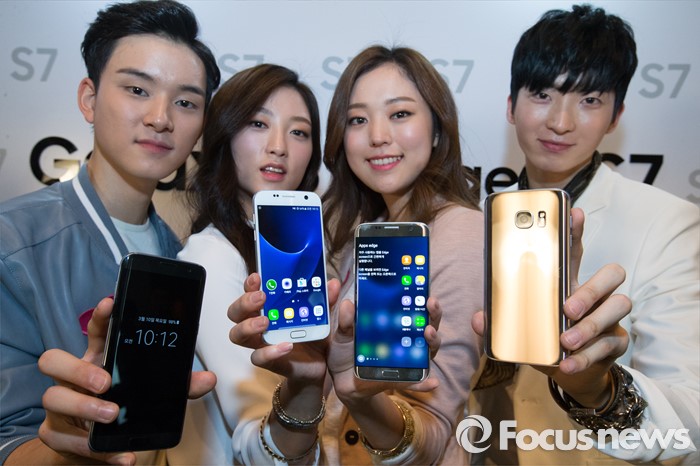 (서울=포커스뉴스) 10일 오전 서울 중구 신라호텔에서 삼성전자의 스마트폰 '갤럭시 S7 엣지와 갤럭시 S7'을 모델들이 선보이고 있다. 이번 제품은 듀얼 픽셀과 F1.7 조리개 탑재, 방수·방진과 대용량 배터리가 탑재되어 있다.