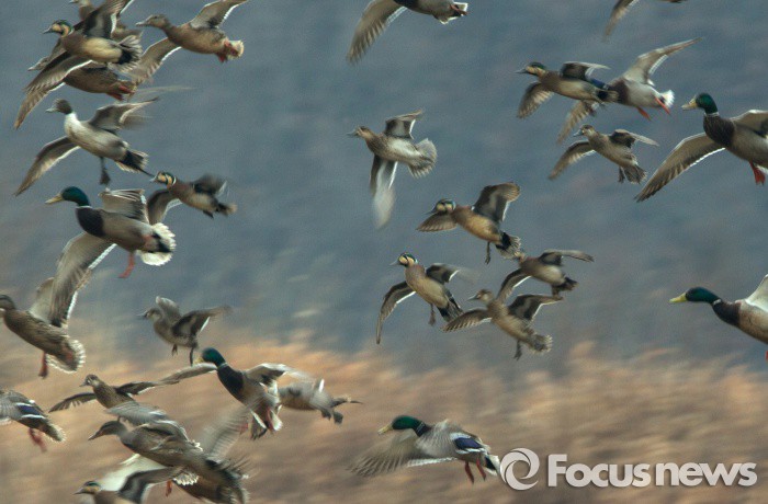 10일 오전 강원 철원군 동송읍 양지리에서 청둥오리, 고방오리 무리 사이에 가창오리(머리에 태극모양을 가진 놈이 수컷) 수십 마리가 섞여서 북상하고 있는 모습이 포커스뉴스 카메라에 포착됐다.