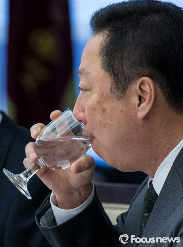 (서울=포커스뉴스) 10일 오전 서울 중구 대한상공회의소에서 열린 국세청장 초청 전국상의 회장단 정책간담회에 참석한 박용만 대한상의 회장이 물을 마시고 있다.