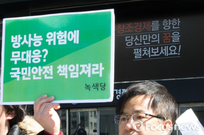 (서울=포커스뉴스) 녹색당 탈핵선거운동본부원들이 10일 오전 서울 종로구 광화문 KT사옥 앞에서 학교 인조잔디의 방사능점검을 촉구하고 있다.