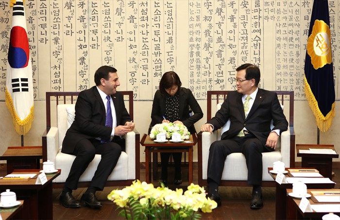 (서울=포커스뉴스) 정의화(오른쪽) 국회의장이 10일 오전 서울 여의도 국회 의장접견실에서 삼벨 파르마니얀(Samvel FARMANYAN) 아르메니아-한국 의원친선협회장과 만나 환담하고 있다. <사진제공=국회>