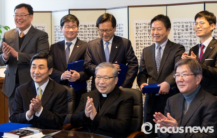 (서울=포커스뉴스) 10일 오후 서울 중구 명동성당에서 열린 '장발장법 통과에 대한 감사패 전달식'에서 이종걸(앞줄 맨 왼쪽) 더불어민주당 원내대표와 염수정 추기경을 비롯한 참석자들이 기념촬영을 갖고 있다.