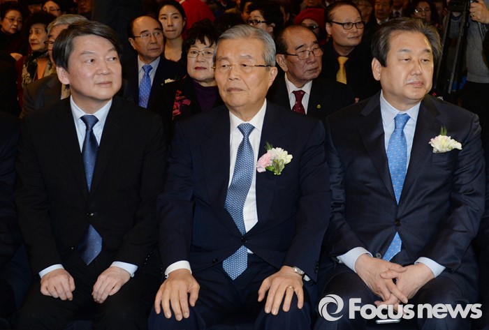 (서울=포커스뉴스) 김무성(오른쪽부터) 새누리당 대표, 김종인 더불어민주당 비대위 대표, 안철수 국민의당 상임공동대표가 10일 오후 서울 종로구 세종문화회관 세종홀에서 열린 김종필 전 국무총리의 정치인생을 담은 '김종필 증언록' 출판기념회에 참석해 자리하고 있다.