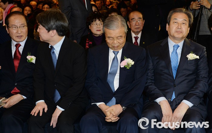 (서울=포커스뉴스) 안철수 국민의당 상임공동대표와 신경식 대한민국헌정회장이 10일 오후 서울 종로구 세종문화회관 세종홀에서 열린 김종필 전 국무총리의 정치인생을 담은 '김종필 증언록' 출판기념회에 참석해 대화하고 있다. 왼쪽부터 신 회장, 안 상임공동대표, 김종인 더불어민주당 비대위 대표, 김무성 새누리당 대표.