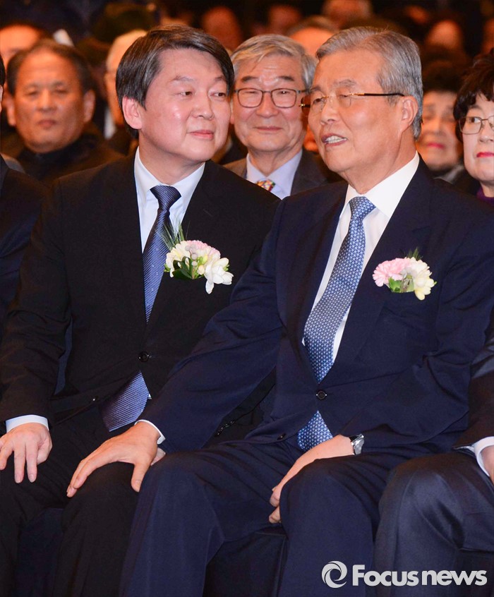 (서울=포커스뉴스) 김종인(오른쪽) 더불어민주당 비대위 대표와 안철수 국민의당 상임공동대표가 10일 오후 서울 종로구 세종문화회관 세종홀에서 열린 김종필 전 국무총리의 '김종필 증언록' 출판기념회에 참석해 대화하고 있다.