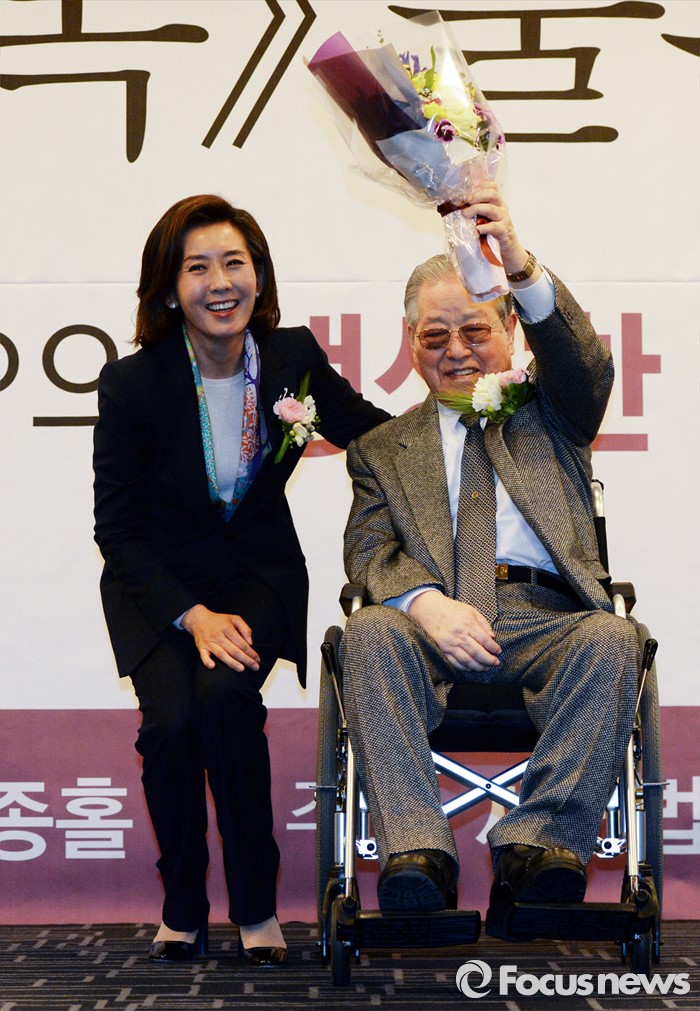 (서울=포커스뉴스) 김종필(오른쪽) 전 국무총리가 10일 오후 서울 종로구 세종문화회관 세종홀에서 열린 자신의 '김종필 증언록' 출판기념회에 참석해 인사말을 마친 뒤 나경원 새누리당 의원으로부터 꽃다발을 받고 있다.