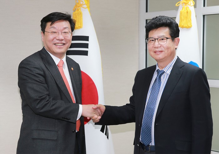 (서울=포커스뉴스) 주형환 산업통상자원부 장관이 10일 오후 서울 종로구 정부서울청사 별관 외교부 집무실에서 장구이핑(张桂平) 중국 쑤닝환치우그룹(Suning Universal) 회장과 면담에 앞서 악수를 하고 있다. <사진제공=산업통상자원부>