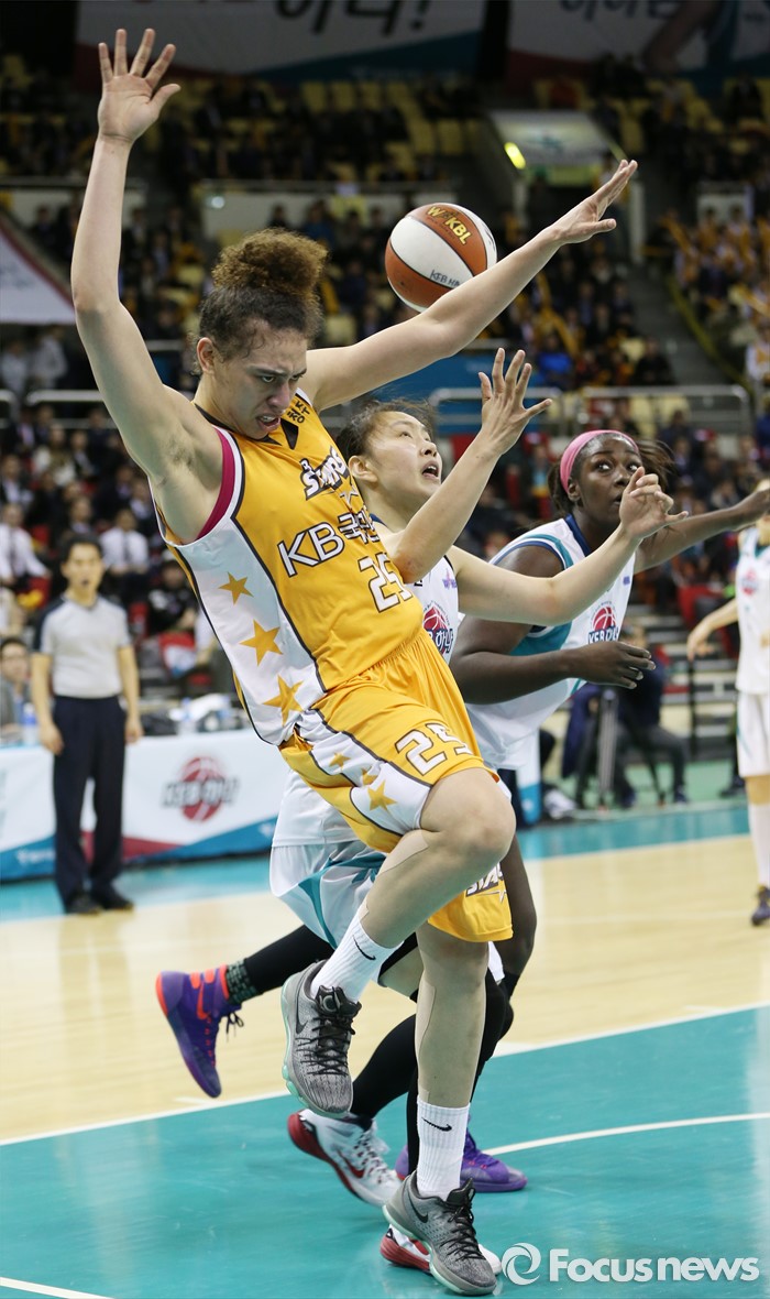 (부천=포커스뉴스) 10일 부천체육관에서 열린 2015-2016 여자프로농구 PO 1차전 KEB하나-KB스타즈 경기에서 KB스타즈 햄비와 KEB하나 염윤아가 리바운드를 다투다 볼을 놓치고 있다.