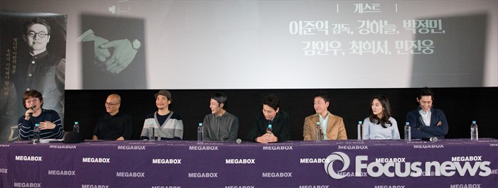 (서울=포커스뉴스) 10일 오후 서울 강남구 코엑스 메가박스에서 열린 영화 '동주'의 관객과의 대화에 참석한 신연식 각본가가 관객 질문에 답변하고 있다. 왼쪽부터 신연식 각본가, 이준익 감독, 모그 음악감독, 배우 강하늘, 박정민, 김인우, 최희서, 민진웅.