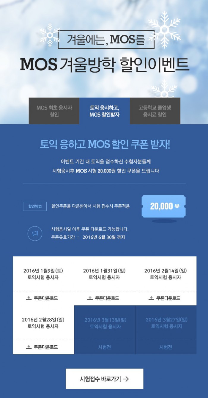 이번 할인 이벤트는 올 1~3월 토익에 응시한 수험생이 대상으로, MOS 전 과목 접수에 사용 가능한 2만원 할인쿠폰을 제공한다. YBM IT 홈페이지에서 간단한 인증절차 후 할인쿠폰을 다운로드 받을 수 있다. 쿠폰 유효기간은 6월30일까지다.