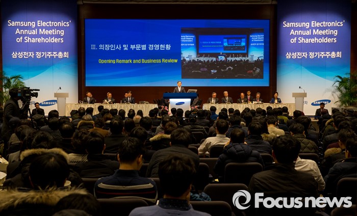 (서울=포커스뉴스) 11일 오전 서울 서초구 삼성전자 본사 다목적홀에서 열린 47기 정기주주총회에 참석한 권오현 이사회 의장(대표이사 부회장)이 인사말을 하고 있다.