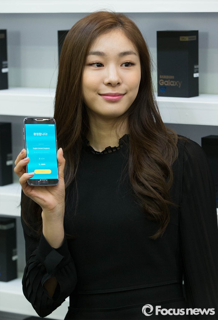 (서울=포커스뉴스) 11일 오전 서울 종로구 종각 T월드 카페에서 삼성 갤럭시 S7 론칭행사에 참석한 전 피겨국가대표 김연아가 S7을 선보이고 있다.