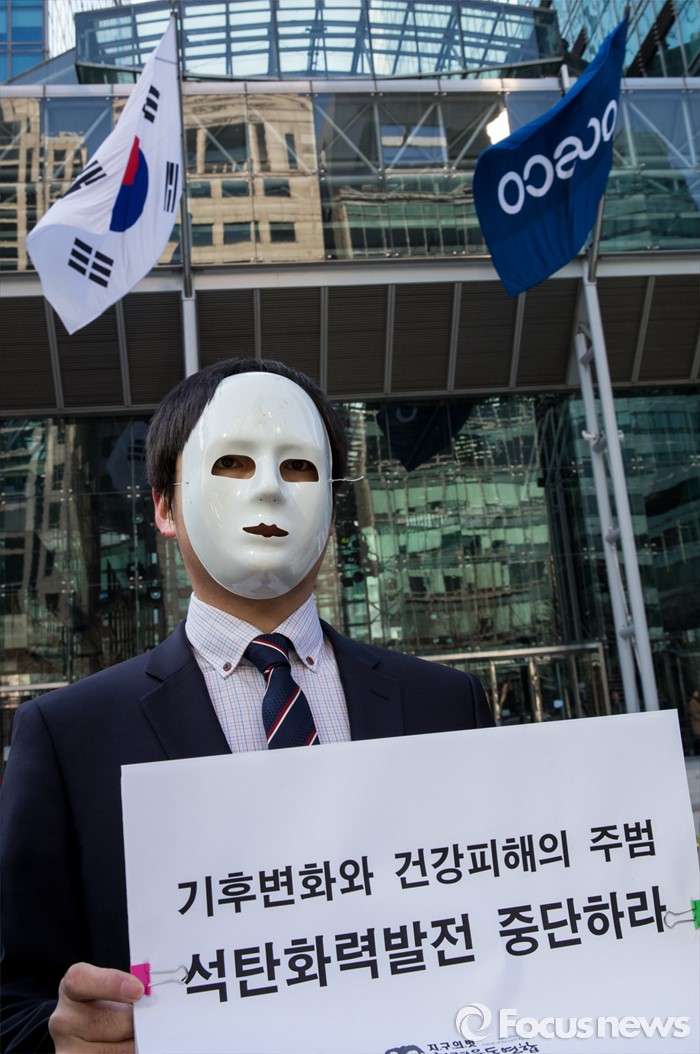 (서울=포커스뉴스) 11일 오전 서울 강남구 포스코센터 앞에서 환경운동연합 회원들이 포스코의 석탄화력발전소 추진을 규탄하는 기자회견을 갖고 있다.