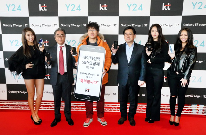 이날 출시된 갤럭시S7·S7 엣지의 국내 출고가는 32기가바이트(GB) 기준 각각 83만6000원, 92만4000원으로 책정됐다. 64GB 모델은 갤럭시S7이 88만원, 갤럭시S7 엣지가 96만8000원이다.KT의 갤럭시S7 1호 개통자 이원구(39)씨가 걸그룹 시스타, KT 임원들과 기념촬영을 하고 있다.<사진제공=KT>서울 종각 T월드카페에서 갤럭시S7 개통을 기다리는 사람들(위). 2016.03.11 왕해나 기자 e2@focus.co.kr 피겨선수 김연아와 기념촬영하고 있는 이건희(26)씨.<사진제공=SK텔레콤>