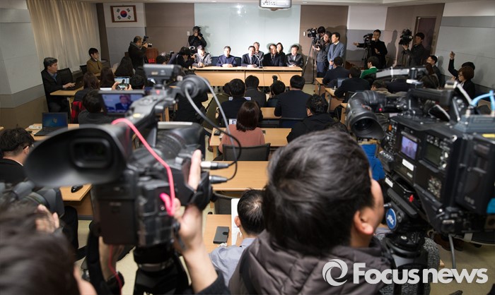 (서울=포커스뉴스) 11일 오전 서울 영등포구 중소기업중앙회 중회의실에서 정기섭 회장을 비롯한 임원들이 북한당국의 개성공단 자산 청산통보에 대한 입주기업의 입장을 발표하고 있다.