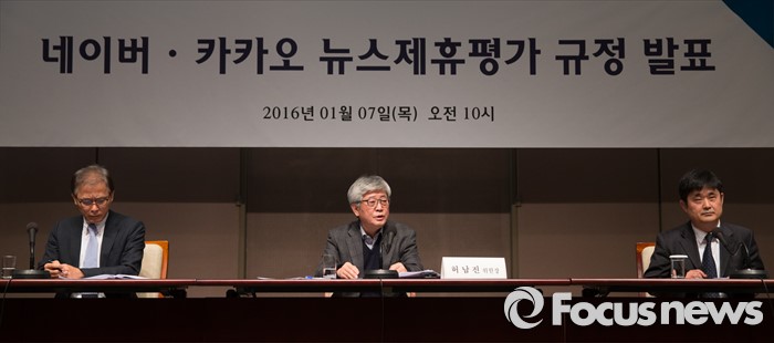 한편 뉴스제휴평가위는 지난 4일 총 27명의 위원이 참석한 가운데 정기 회의를 열고 본격적인 평가 활동을 시작했다. 이번 정기 회의에서는 제 1차 뉴스검색제휴 신청 현황 및 평가 일정이 공유됐으며, 네이버-카카오 뉴스 제휴 및 제재 심사 규정 시행 후 발생한 부정 행위 추이, 시정 요청 사례에 대한 논의가 이뤄졌다.(서울=포커스뉴스) 인터넷 포털 네이버와 카카오의 뉴스 제휴 심사를 담당할 '뉴스제휴평가위원회'가 7일 오전 서울 중구 프레스센터에서 '네이버-카카오 뉴스 제휴 및 제재 심사 규정'을 발표하는 기자간담회를 진행하고 있다. 배정근 제 1 소위원장, 허남진 위원장, 김병희 제 2 소위원장(왼쪽부터)이 세부 규정에 대해 발표하고 있다. 발표한 규정은 3월 1일부터 시행된다. 2016.01.07 김흥구 기자