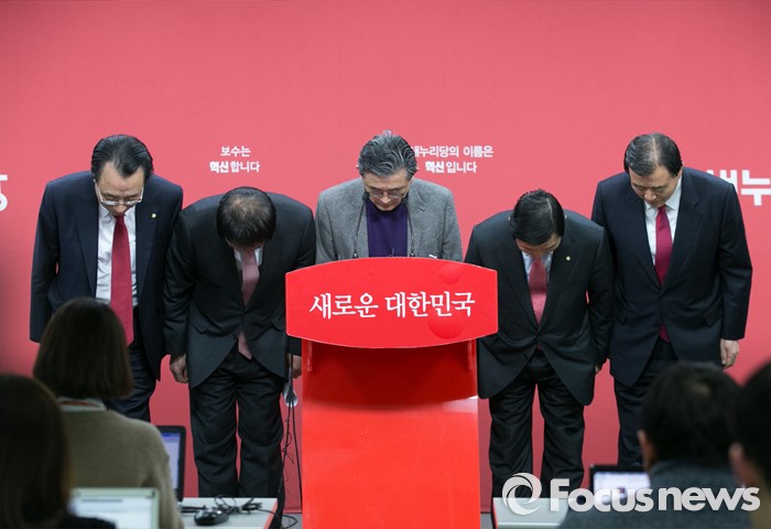 (서울=포커스뉴스) 이한구 새누리당 공천관리위원장과 위원들이 11일 오후 서울 여의도 당사에서 공관위 내부 갈등 등에 대해 사과하는 내용의 기자회견을 하고 있다. 왼쪽부터 김회선, 박종희 위원, 이 위원장, 황진하 부위원장, 홍문표 위원.