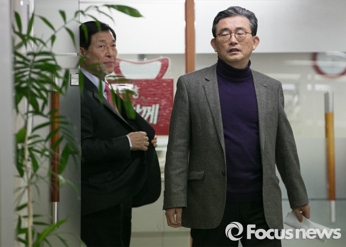 (서울=포커스뉴스) 이한구(오른쪽) 새누리당 공천관리위원장과 황진하 부위원장이 11일 오후 서울 여의도 당사에서 공관위 내부 갈등 등에 대해 사과하는 내용의 기자회견을 위해 입장하고 있다.