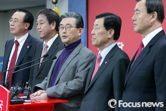 (서울=포커스뉴스) 이한구 새누리당 공천관리위원장과 위원들이 11일 오후 서울 여의도 당사에서 공관위 내부 갈등 등에 대해 사과하는 내용의 기자회견을 하고 있다. 왼쪽부터 김회선, 박종희 위원, 이 위원장, 황진하 부위원장, 홍문표 위원.