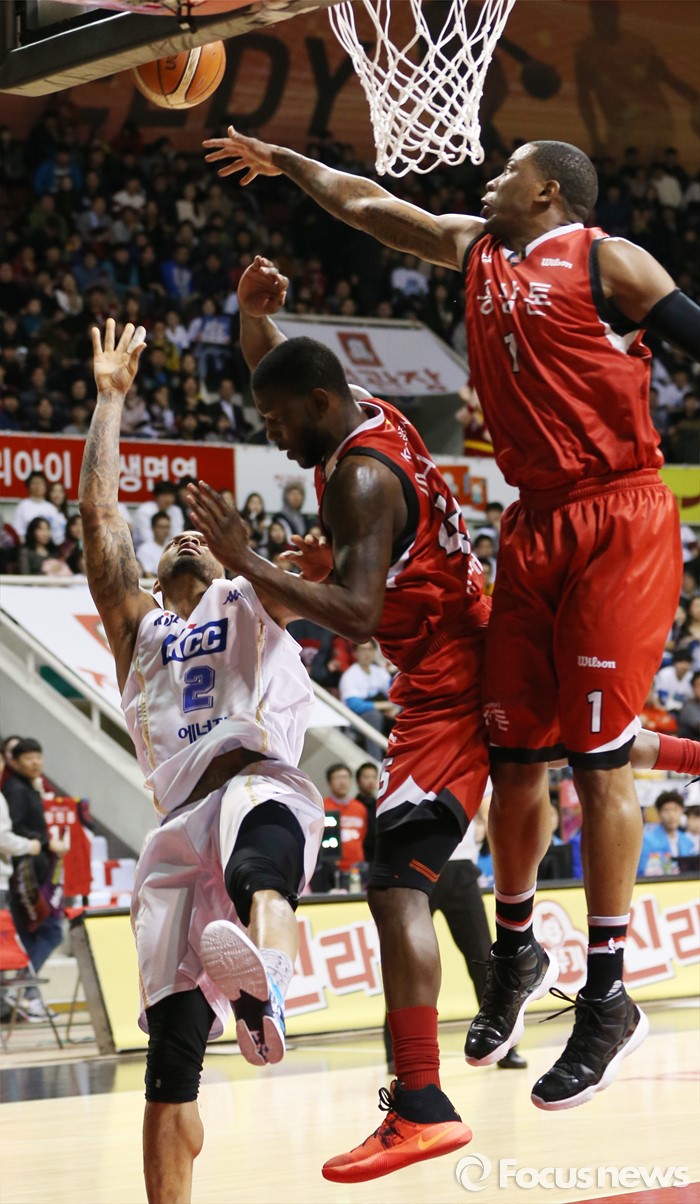 연장전 들어 좀 더 높은 집중력을 발휘한 쪽은 KGC였다. 84-82로 리드하던 KGC는 박빙의 승부가 이어지는 상황에서 이정현의 3점슛이 터지면서 87-82로 달아났고 이로써 사실상 승부는 갈렸다. 결국 KGC는 리드를 유지하며 90-86으로 승리했다.(안양=포커스뉴스) 11일 안양실내체육관에서 열린 2015-2016 프로농구 KGC-KCC 4강플레이오프 3차전에서 KCC 에밋의 슈팅을 KGC 찰스 로드와 마리오 리틀이 마크하고 있다. 2016.03.11 우정식 기자