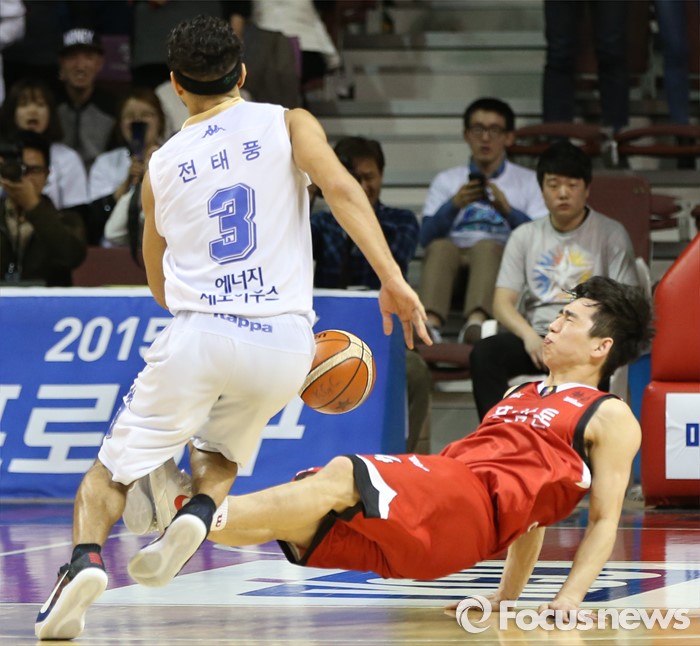 (안양=포커스뉴스) 11일 안양실내체육관에서 열린 2015-2016 프로농구 KGC-KCC 4강플레이오프 3차전에서 KCC 전태풍과 충돌한 KGC 김윤태가 넘어지고 있다. KCC는 전태풍의 공격자 반칙으로 공격권을 넘겨 줬다.