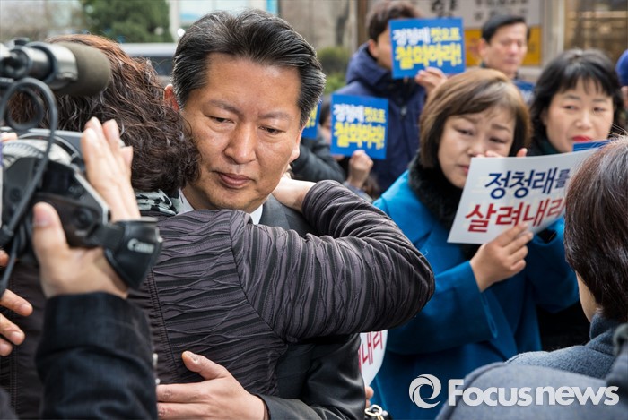 (서울=포커스뉴스) 20대 총선 공천 배제된 정청래 더불어민주당 의원이 12일 오전 공직선거후보자추천재심위원회에 재심신청서를 제출하기 위해 서울 여의도 더민주 당사를 향하며 지지자들과 포옹하고 있다.