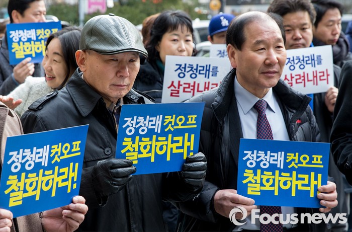 (서울=포커스뉴스) 12일 오전 서울 여의도 더민주 당사 앞에서 정청래 더불어민주당 의원 지지자들이 정 의원의 컷오프 철회를 요구하는 손팻말을 들고 있다. 이날 정 의원은 공직선거후보자 추천 재심위 재심신청서 접수를 마쳤다.