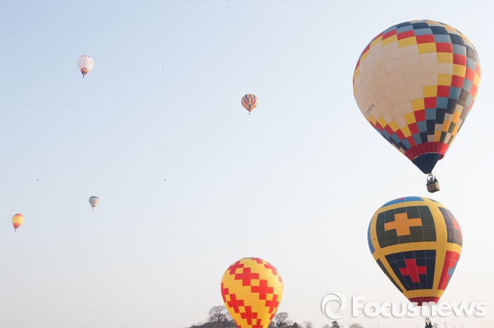(논산=포커스뉴스) 12일 오전 충남 논산 강경읍 수변공원 일대에서 열린 2015-2016시즌 코리아열기구그랑프리 5차전 ‘오프로드컵’에서 대회에 출전한 선수들이 공중 레이스를 펼치고 있다.