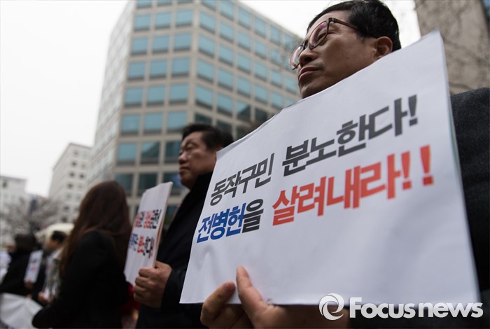 (서울=포커스뉴스) 13일 오전 서울 여의도 더민주 당사 앞에서 전병헌 더불어민주당 의원 지지자들이 정 의원의 컷오프 철회를 요구하는 손팻말을 들고 있다.