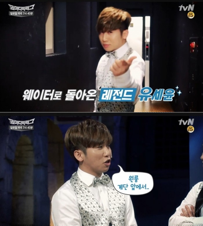 CJ E&M은 13일 "'코미디빅리그' 13일 방송에 개그맨 유세윤이 특별출연한다"고 밝혔다. 유세윤은 유상무가 출연 중인 '직업의 정석' 코너에 막내 웨이터로 깜짝 등장한다. 프로그램 다른 코너에 출연 중인 장동민도 깜짝 등장한다.
