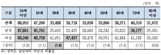 2014년을 기준으로 건강보험 적용인구 10만명당 급성상기도감염 환자수를 연령대별로 살펴보면, 남성은 10세 미만 8만7891명, 10대 4만5791명, 70대 3만9177명 순으로 나타났으며, 여성은 10세 미만이 8만8249명, 10대 4만8758명, 30대 4만7427명 순이었다.
