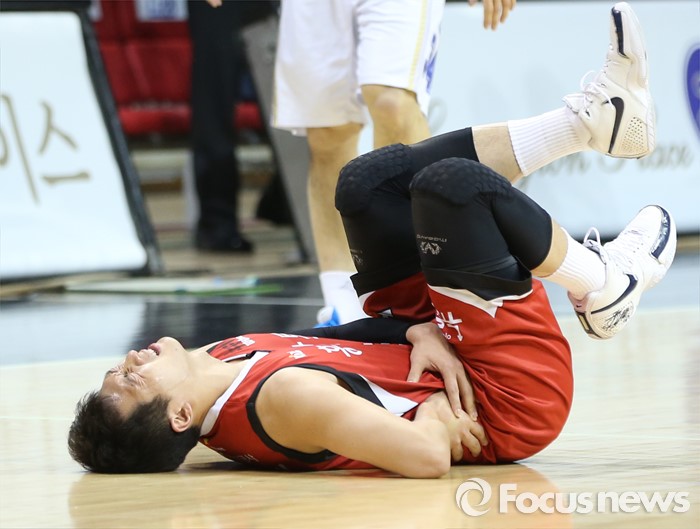 (안양=포커스뉴스) 13일 안양실내체육관에서 열린 2015-2016 프로농구 KGC-KCC 4강플레이오프 4차전에서 KGC 이정현이 옆구리를 붙잡고 고통스러워하며 코트에 누워있다.