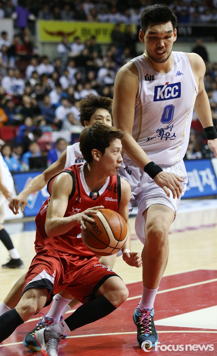 (안양=포커스뉴스) 13일 안양실내체육관에서 열린 2015-2016 프로농구 KGC-KCC 4강플레이오프 4차전에서 KGC 김기윤이 KCC 하승진 앞에서 드리블하고 있다.