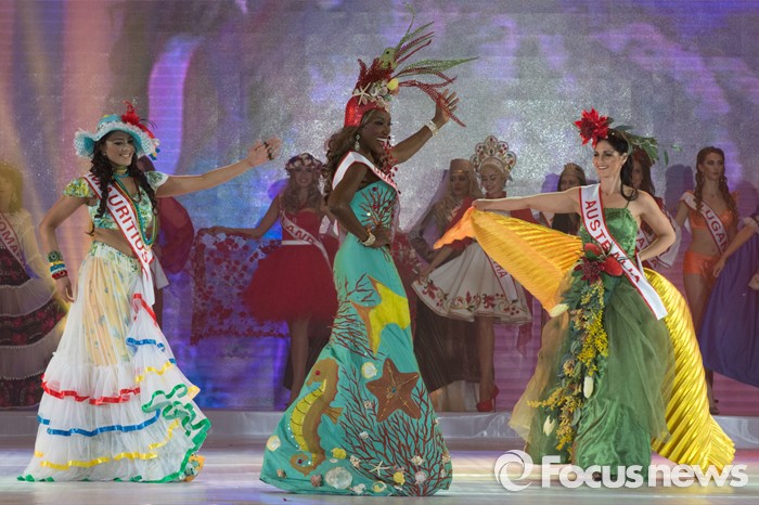 (동관/중국=포커스뉴스) 중국 광동성 동관에서 12일 오후 열린 제27회 미시즈월드 미인대회에서 각 나라의 대표 참가자들이 전통의상을 입고 춤을 추고 있다. 우승은 남아프리카 공화국의 캔디스 드보라 아브람스, 2위는 폴란드의 클라우디아 마트라크 두덱, 3위는 한국의 최은혜가 차지했다.