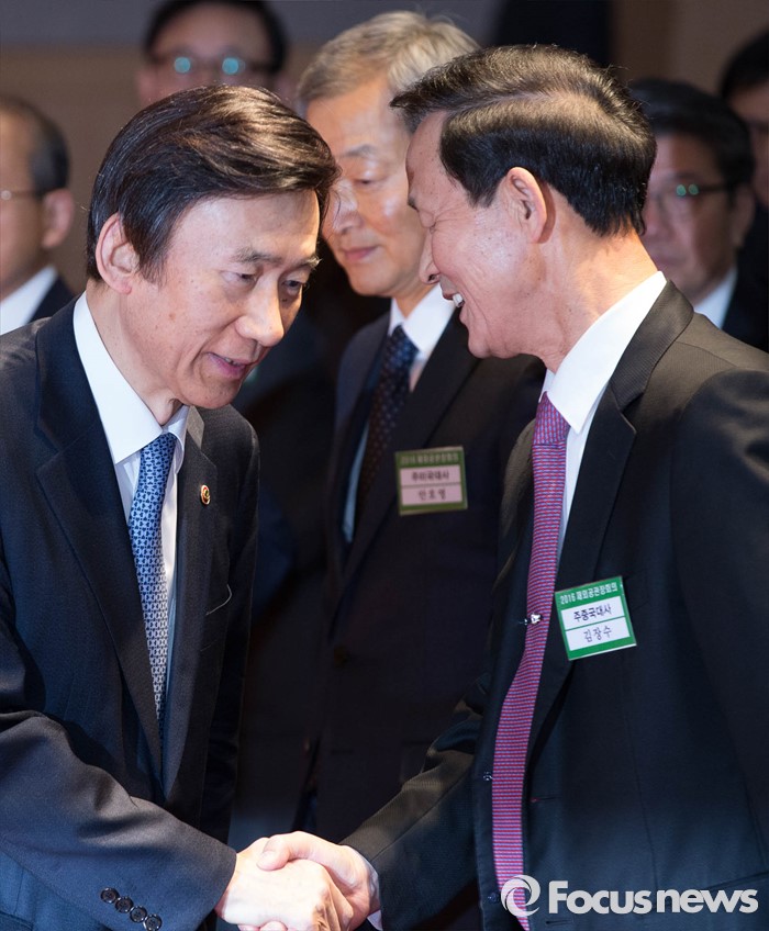 (서울=포커스뉴스) 14일 오전 서울 종로구 외교부 청사에서 열린 '2016년도 재외공관장회의'에 참석한 윤병세(왼쪽) 외교부 장관이 김장수 주중대사와 악수를 나누고 있다.