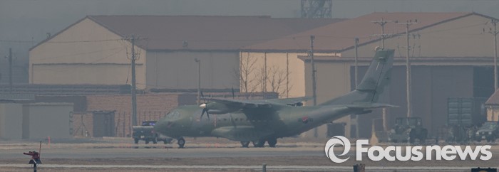 (평택=포커스뉴스) 한·미연합훈련(키리졸브연습·독수리훈련·쌍용훈련) 2주차를 맞아 북한 진격 위주의 2부 훈련에 돌입한 14일 오전 경기도 평택시 주한미군 오산공군기지에 한국 공군 소속의 CN-235 수송기가 착륙해 이동하고 있다.