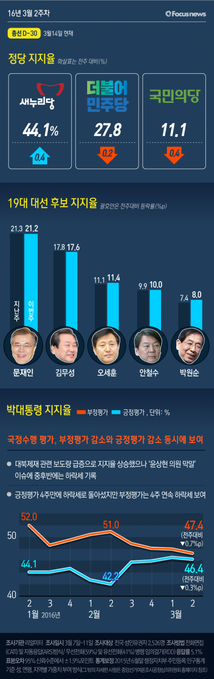 이번 주간집계는 2016년 3월 7일부터 11일까지 5일간 전국 19세 이상 유권자 2,526명을 대상으로 전화면접(CATI) 및 자동응답(ARS) 방식으로 무선전화(59%)와 유선전화(41%) 병행 임의걸기(RDD) 방법으로 조사했고, 응답률은 5.1%이다. 통계보정은 2015년 12월말 행정자치부 주민등록 인구통계 기준 성, 연령, 권역별 가중치 부여 방식으로 이루어졌고, 표집오차는 95% 신뢰수준에서 ±1.9%p이다. 일간집계는 ‘2일 이동 시계열(two-day rolling time-series)’ 방식으로 3월 7일 1,011명, 3월 8일 1,011명, 9일 1,003명, 10일 1,013명, 11일 1,014명을 대상으로 실시했고, 응답률은 3월 7일 5.1%, 8일 4.9%, 9일 5.0%, 10일 5.4%, 11일 5.3%, 표집오차는 5일간 모두 95% 신뢰수준에서 각각 ±3.1%p이다. 일간집계의 통계보정 방식은 주간집계와 동일하다.