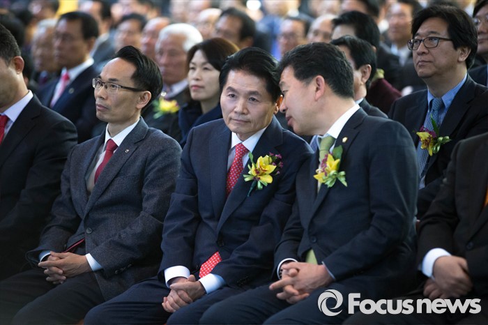 (서울=포커스뉴스) 김병원 농협 신임 회장이 14일 오전 서울 중구 농협 중앙회에서 열린 신임 회장 취임식에 참석, 한 참석자와 귀엣말을 하고 있다.