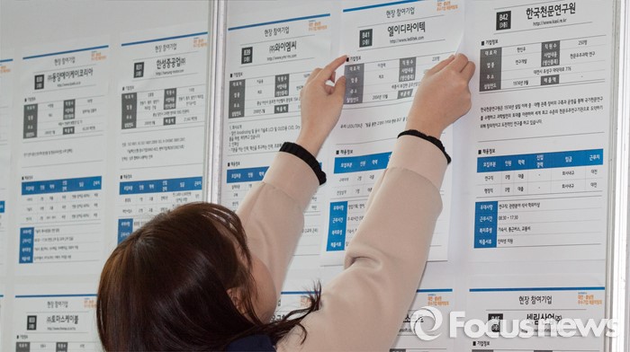 (대전=포커스뉴스) 14일 오전 대전시청에서 열린 청년희망로드쇼 대전·충남권 우수기업 채용박람회에서 관게자가 구직정보를 붙이고 있다.