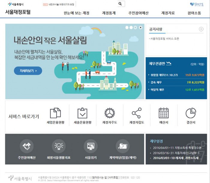 아울러 2월과 8월 공개되는 서울시 재정공시 항목 중 시민들의 관심이 높은 세입‧세출 예산, 재정자립도, 채권, 채무현황, 재정성과 등에 대해 운용상황을 간략하게 보여줘 사용자 편리성을 높인다.