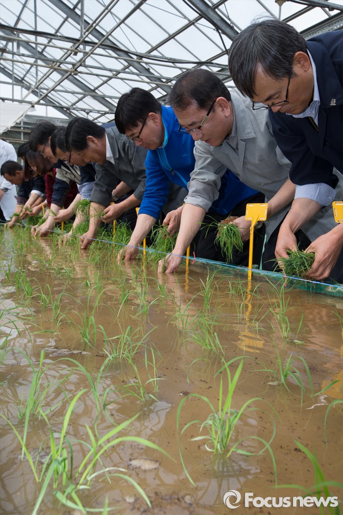 (청주=포커스뉴스) 14일 오후 충북 청주시 청원구 오창읍 충북농업기술원에서 열린 기능성 유색미 신품종 육성을 위한 첫 모내기 행사에서 박제국 충북행정부지사와 직원들이 모내기를 하고 있다.