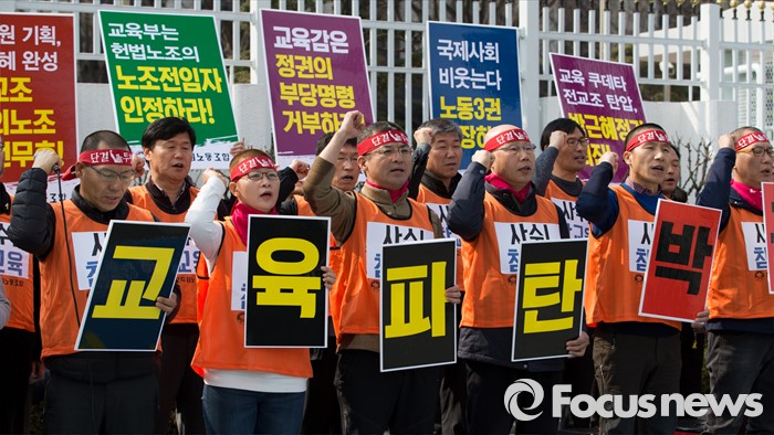 (서울=포커스뉴스) 14일 오후 서울 종로구 정부서울청사 앞에서 전국교직원노동조합 전임자들이 정부의 법외노조 후속조치와 부당탄압에 항의하는 삭발식 후 구호를 외치고 있다.
